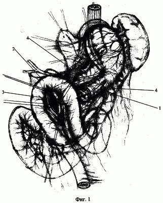 Выбирают петлю тощей кишки в месте наибольшей мобильности брыжейки, обычно на расстоянии 15-25 см от связки Трейтца, на уровне 2-3 мезентериальных артерий. В бессосудистом участке брыжейки поперечной ободочной кишки создают “окно” и в верхний этаж брюшной полости проводят выбранную петлю тощей кишки 2 (фиг.1). Между прямыми сосудами брыжейки этой петли создают “окно” 3 (фиг.1) размером около 2,0-2,5 см. В области основания желудочной трубки 1 (фиг.1) накладывают четыре восьмиобразных лавсановых шва 4 (фиг.1), концами нитей прошивают края брыжеечного “окна” петли тощей кишки. Затягивая эти швы, желудочную трубку проводят через брыжеечное “окно”, в результате чего петля кишки оказывается надетой на желудочную трубку проксимальной культи желудка. После этого стенка кишки свободно и равномерно прилегает к стенкам желудочной трубки, охватывая ее своей внутренней стороной на протяжении приблизительно 3,0 см.