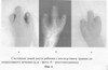 Больной К., 13 лет, с диагнозом: посттравматическая деформация левой кисти (последствие взрывного ранения). На кисти частично сохранены основные фаланги 1, 2, 5-го пальцев 3, 4-й пальцы полностью отсутствуют вместе с пястными костями (фиг. 4). Отмечается ограничение активных движений в сохранившихся пястно-фаланговых суставах.