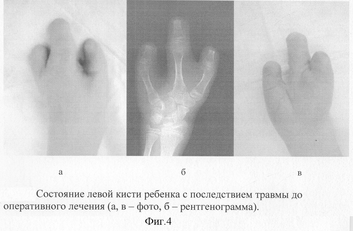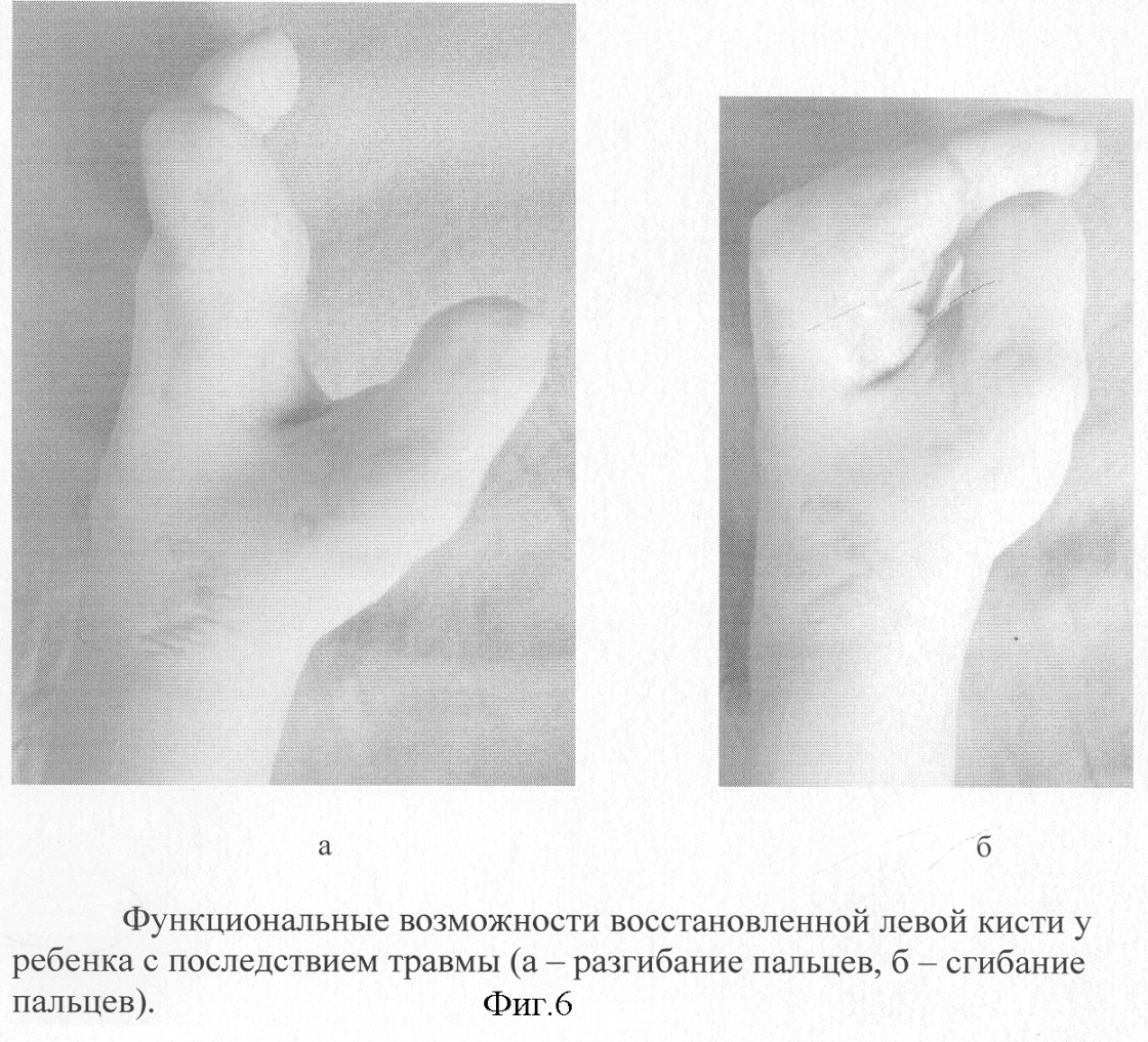 Задачей изобретения является восстановление функции и косметического состояния кисти у детей с последствиями травмы.