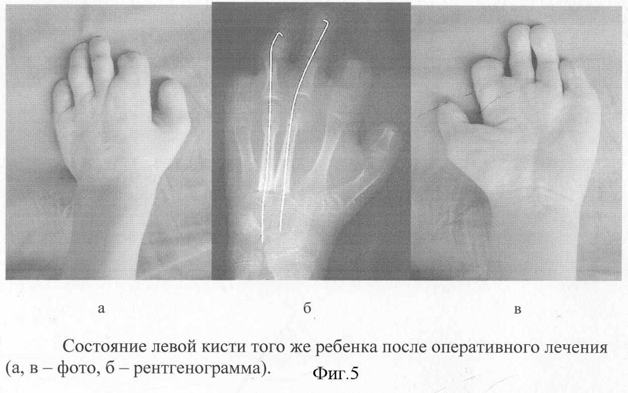 Пальцы стопы перенесены на кисть. Выполнена клиновидная резекция плюсневых костей для изменения сектора движения в плюсне-фаланговых суставах. Пальцы фиксированы спицами к костям запястья (фиг.5). Наложены швы на сухожилия сгибателей и разгибателей. С использованием операционного микроскопа наложены анастомозы на пальцевые нервы, артерии и вены трансплантатов и реципиентной области. После снятия клипс с сосудов восстановлено кровообращение в пересаженных трансплантатах. Наложены швы на кожу. Нижние и левая верхняя конечности уложены в гипсовые шины.