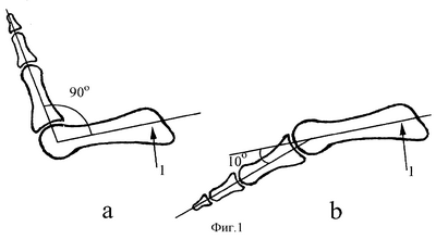 На фиг.3 – схема конечного результата оперативного вмешательства. Угол разгибания (а) пальца стопы в плюснефаланговом суставе уменьшен до 10°, а угол сгибания (б) увеличен до 90°.