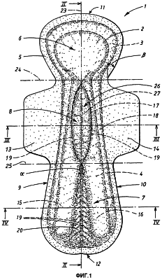 Согласно описанному варианту исполнения изобретения первый абсорбирующий слой 17 является более жестким, чем второй абсорбирующий слой 18. Но материал первого абсорбирующего слоя 17 не обязательно должен быть сам по себе более жестким, чем второй абсорбирующий слой 18, т.е. первый абсорбирующий слой 17 может быть изготовлен так, чтобы он становился более жестким, чем второй абсорбирующий слой 18, например после ламинирования с использованием клея нескольких слоев одного и того же материала или различных материалов или в результате использования другого подходящего способа изготовления. Первый абсорбирующий слой 17 выполняет роль формирующей части, таким образом участок первого абсорбирующего слоя 17, расположенный по существу в зоне задней части 7, разделен на первую ножку 15 и вторую ножку 16, начиная от точки вблизи второй линии 25 поперечного сечения. Упомянутая вторая линия 25 поперечного сечения проходит в поперечном направлении абсорбирующего изделия, пересекая боковые края 9, 10 абсорбирующего изделия. Ножки 15, 16 образуют угол в точке, где они начинают расходиться. Угол между ножками 15, 16 составляет 10-120°, предпочтительно 15-40°; а длина ножек составляет 20-350 мм, предпочтительно 50-150 мм. Вторая линия 25 поперечного сечения размещена в воображаемой области, где задняя часть 7 сходится с центральной частью 8.