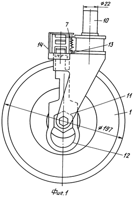 Устройство содержит колесо 1, установленное на кронштейне 2, коромысло тормоза 3 на стойке 4, переключающееся педалями 5 на пластинах 6 и подпружиненное 7, при этом 8 и 9 – оси установок пружины 7 и пластин 6 соответственно, а 10 – хвостовик установки колеса 1 на тележку /не показана/, 11 – шестигранник втулки колеса 1, 12 – профильный паз в пластине 6, ответный шестиграннику 11, 13 – зацеп установки пружины 7, 14 – общий кожух.