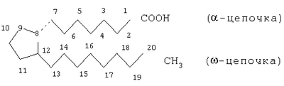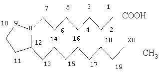 То есть атомы углерода, составляющие основной каркас, нумеруются таким образом, что атом углерода в карбоксильной группе обозначается С-1, а -цепочка содержит атомы углерода от С-2 до С-7, причем номера возрастают по направлении к кольцу, пятичленное кольцо содержит атомы углерода от С-8 до С-12 и -цепочка содержит атомы углерода от С-13 до С-20. В случае меньшего числа атомов углерода в -цепочке нумерация атомов углерода, последующих С-2, должна быть сдвинута надлежащим образом, а когда число атомов углерода больше 1, это соединение называется при условии, что атом углерода в положении С-2 имеет заместитель, вместо карбоксильной группы (в положении С-1). В случае меньшего числа атомов углерода в -цепочке их нумерация должна быть соответственно меньше чем 20, а когда число атомов углерода больше 8, атомы углерода в положении 21 и последующие следует рассматривать как заместитель.