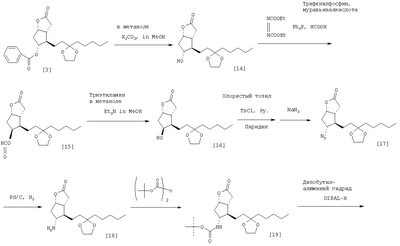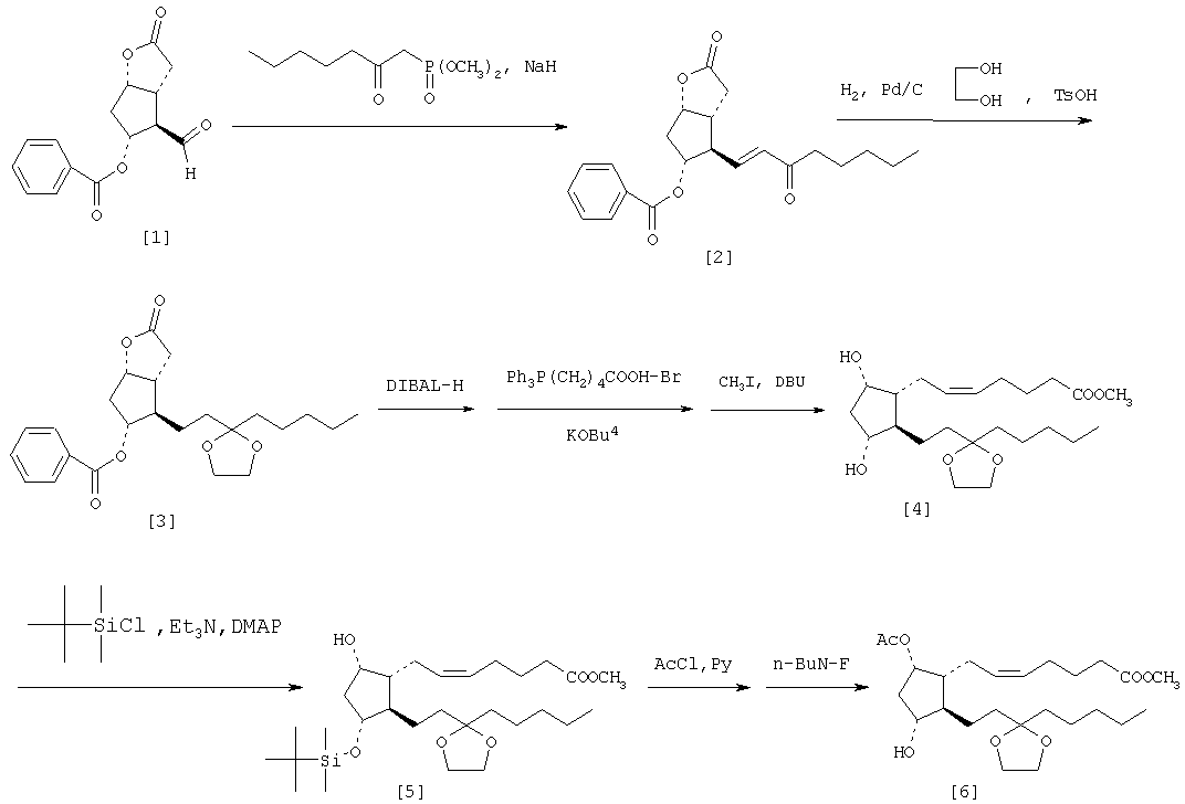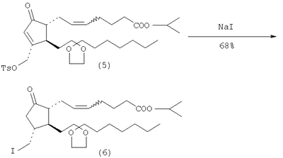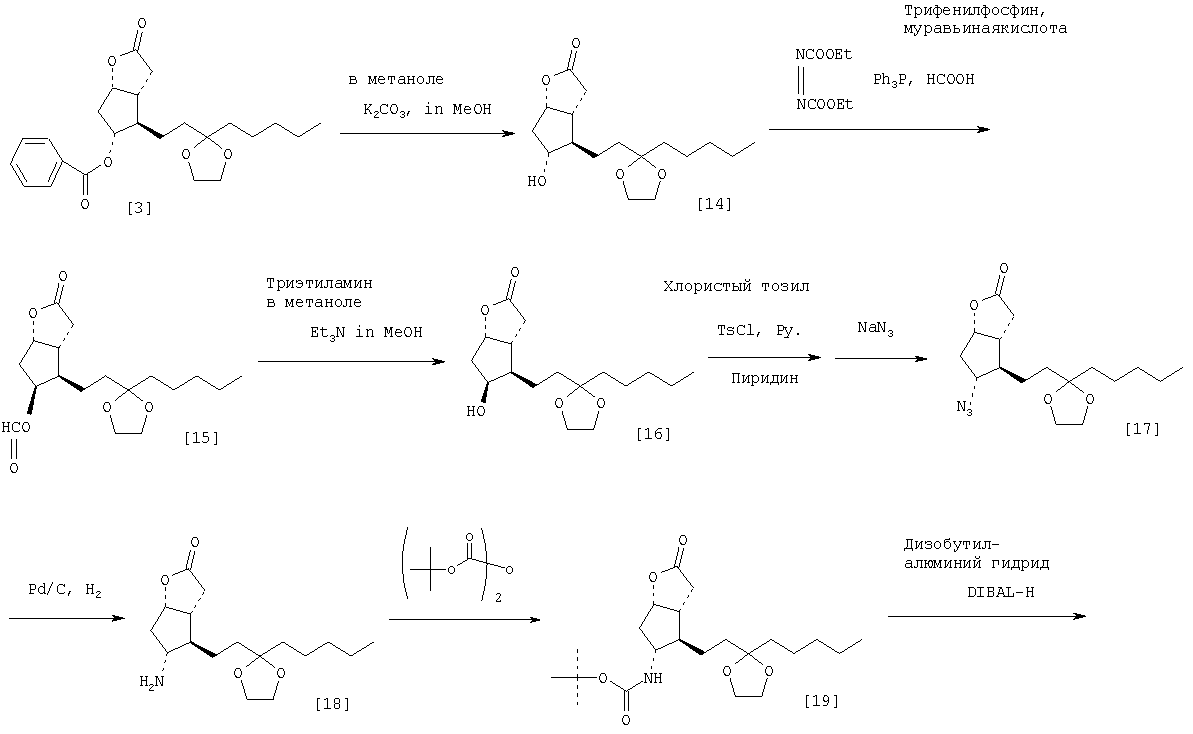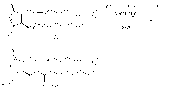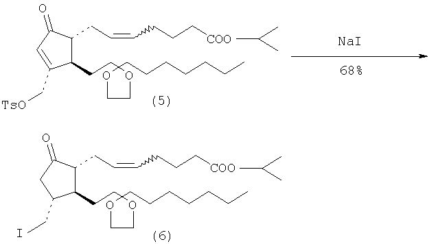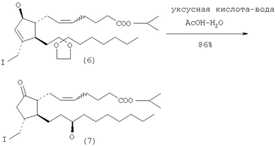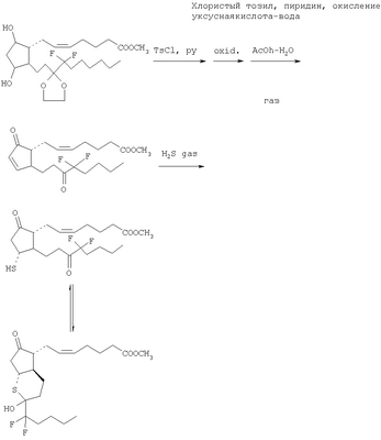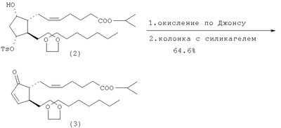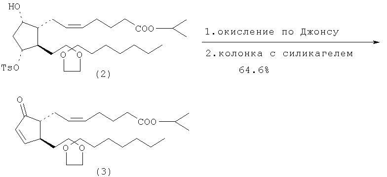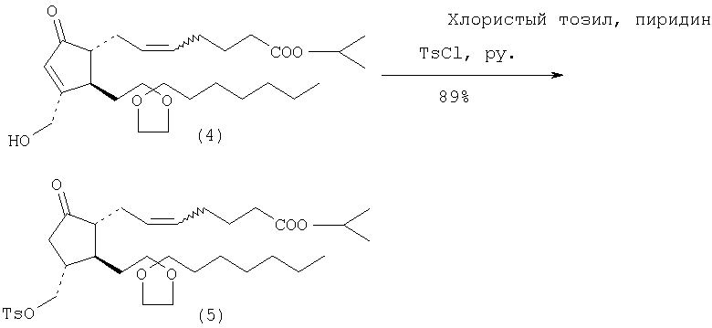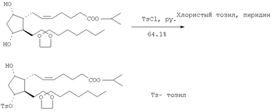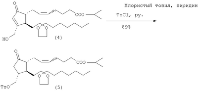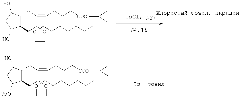 Добавляют к смеси пиридина (0,77 г) и 4,05 г изопропилового эфира (Z) 7-[(1R,2R,3R,5S)-3,5-дигидрокси-2-(3,3-этилендиоксидецил)циклопентил]гепт-5-еновой кислоты (1) в дихлорметане раствор 1,86 г хлористого тозила в дихлорметане при 0°С, и смесь перемешивают 2 суток при этой температуре. В ходе реакции тремя порциями добавляют раздельно 5,58 г хлористого тозила и 2,31 г пиридина. После обычной обработки неочищенный продукт выделяют хроматографически на силикагеле, получая 3,45 г изопропилового эфира (Z) 7-[(1R,2R,3R,5S)-2-(3,3-этилендиоксидецил)-5-гидрокси-3-(п-толуолсульфокси)циклопентил]гепт-5-еновой кислоты (2) с выходом 64,1%.