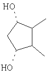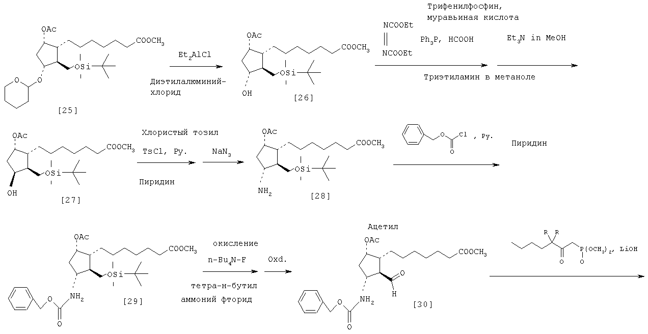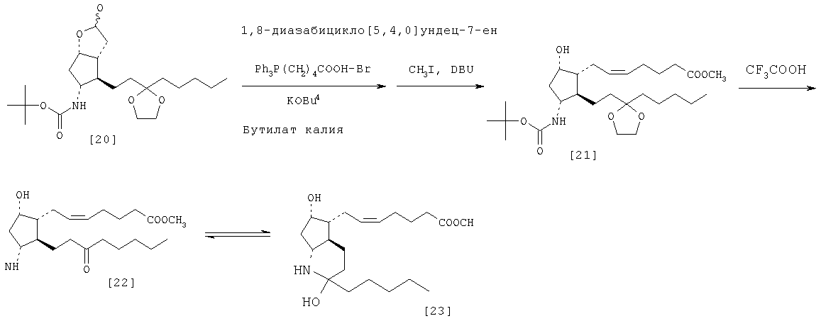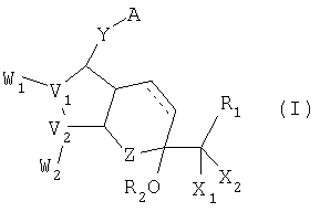 Что касается конфигурации, то она рассматривается в соответствии с конфигурацией указанного выше основного каркаса, если не указано иное. Например, PGD, PGE и PGF означают соединения, в которых имеется гидроксильная группа в положениях С-9 и/или С-11. В настоящем изобретении PG также включает те простагландины, в которых имеется другая группа вместо гидроксильной группы в положениях С-9 и/или С-11, причем они называются 9-дегидрокси-9-замещенными или 11-дегидрокси-11-замещенными простагландиновыми соединениями.