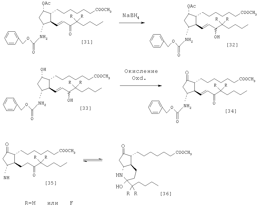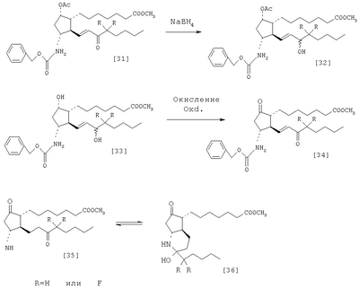 С другой стороны, обнаружено, что PG, имеющие простую 13,14-связь и С-15 карбонильную группу, и те PG, которые имеют двойную 13,14-связь и С-15 карбонильную группу, находятся в продуктах обмена веществ человека или животного. Эти 13,14-дигидро-15-кето-простагландины и 15-кето-простагландины (в последующем называются 15-кето-РС) известны как метаболиты, получаемые естественным путем за счет ферментативного обмена веществ соответствующих PG в живом организме. Сообщалось, что для этих 15-кето-PG едва проявляются различные виды физиологической активности, характерные для PG и что они являются фармакологически и физиологически неактивными метаболитами (см. Acta Physiologica Scandinavica, т.66, с.509-(1966)).