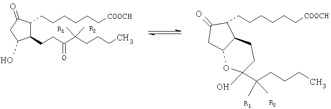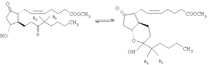 Было установлено, что в отсутствие воды соединения, представленные формулой (I), существуют преимущественно в виде бициклического соединения. Полагают, что в водной среде образуется водородная связь, например, между группой кетона в положении С-15, тем самым затрудняется образование бициклической системы. Кроме того, считается, что атом (атомы) галогена в положении С-16 облегчают образование бициклической системы. Например, моноциклические/бициклические структуры могут присутствовать в соотношении 1:6 в D2O; 1:10 в CD3OD-D2O; и 4:96 в CDCl3. Соответственно предпочтительным вариантом воплощения настоящего изобретения является композиция, в которой бициклическое соединение присутствует в соотношении бициклическое/моноциклическое, равном, по меньшей мере, 1/1 и предпочтительно 20/1 или даже больше, включая практически все бициклическое соединение; 100% бициклическое соединение входит в объем защиты этого изобретения.