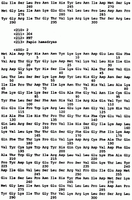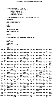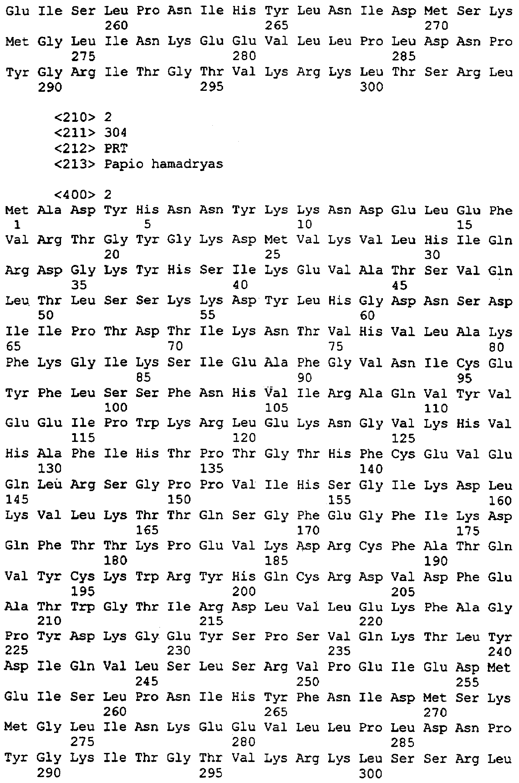 Фиг.6 показывает установленную аминокислотную последовательность СБХ-уриказы (аминокислоты 1-225 ИДЕНТИФИКАТОРА ПОСЛЕДОВАТЕЛЬНОСТИ №1 и аминокислоты 226-304 ИДЕНТИФИКАТОРА ПОСЛЕДОВАТЕЛЬНОСТИ №2) в сравнении с последовательностями свиньи (ИДЕНТИФИКАТОР ПОСЛЕДОВАТЕЛЬНОСТИ №1) и бабуина (ИДЕНТИФИКАТОР ПОСЛЕДОВАТЕЛЬНОСТИ №2). Остатки в последовательности бабуина, отличные от остатков в последовательности свиньи, выделены жирным шрифтом. Впервые последовательности свиньи и бабуина были определены Wu, et al., (1989) и подтверждены настоящими изобретателями. ИДЕНТИФИКАТОР ПОСЛЕДОВАТЕЛЬНОСТИ №1 идентичен Номеру Доступа р 16164 GenBank, за исключением отсутствия начального метионилового остатка в последовательности GenBank. ИДЕНТИФИКАТОР ПОСЛЕДОВАТЕЛЬНОСТИ №2 идентичен Номеру Доступа р25689 GenBank, за исключением отсутствия начального метионилового остатка и замены гистидина треонином в остатке 153 в последовательности GenBank (остаток 154 на фиг.6).
