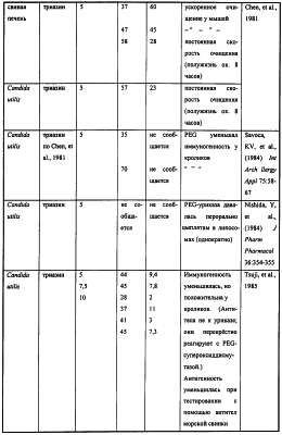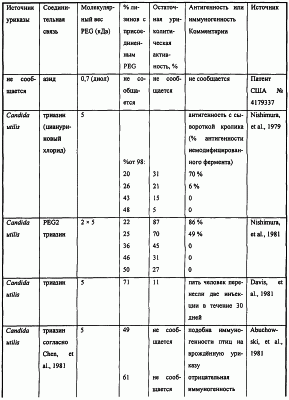 Данные из 13 процитированных источников относительно PEG-илирования уриказы собраны в Таблице 1. Некоторые из этих результатов также представлены графически на фиг.1А-2Б. Семь из этих публикаций описывают значительные уменьшения уриколитической активности, измеренной in vitro, вызванной связыванием различного количества нитей PEG с уриказой из Candida utilis. Связывание большого количества нитей PEG весом 5 кДа с уриказой свиной печени дало подобные результаты, как описано и в публикации Chen, и в сделанном той же группой авторов докладе на симпозиуме. Chen, et al., (1981); Davis, et al., (1978).