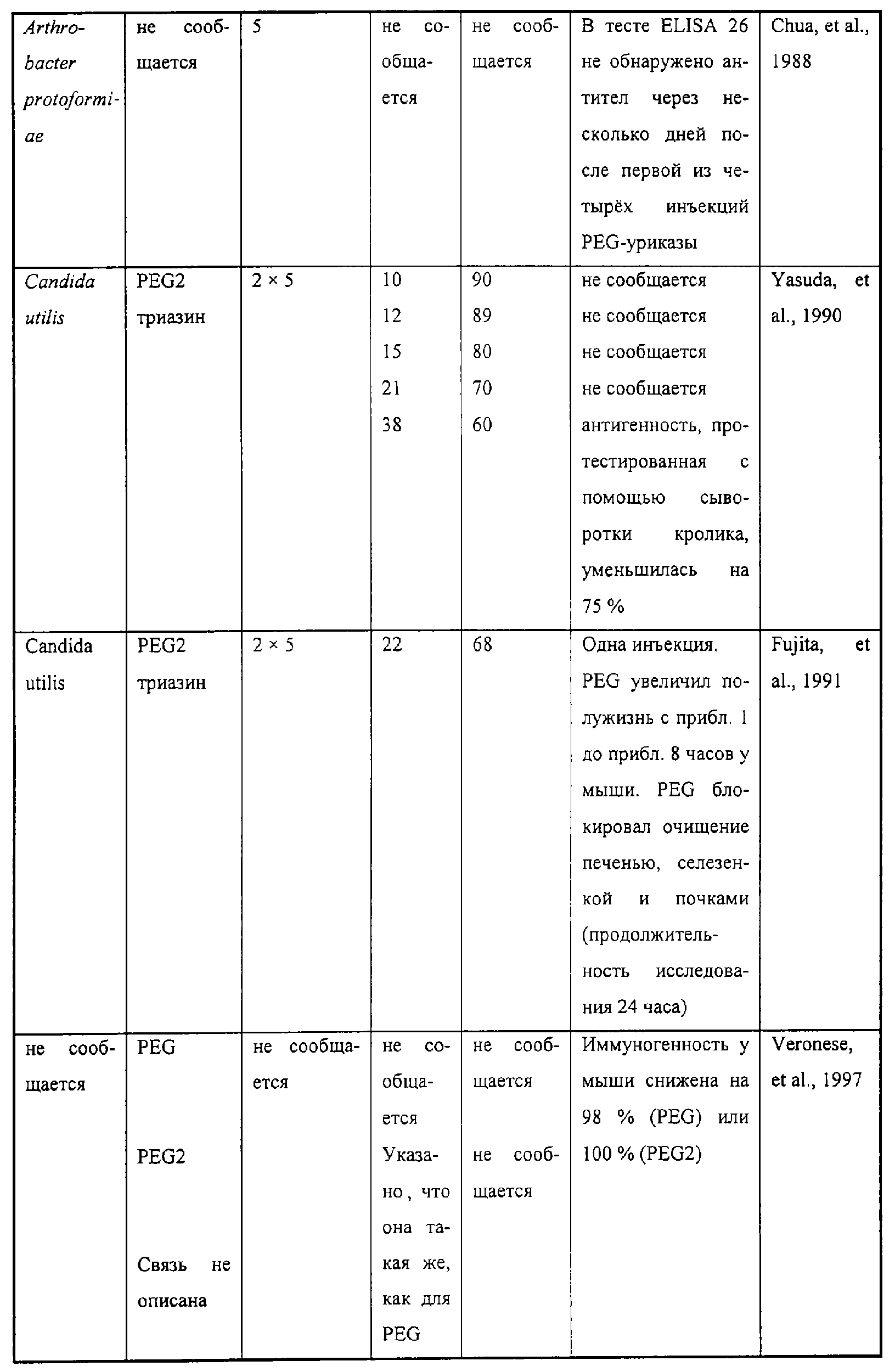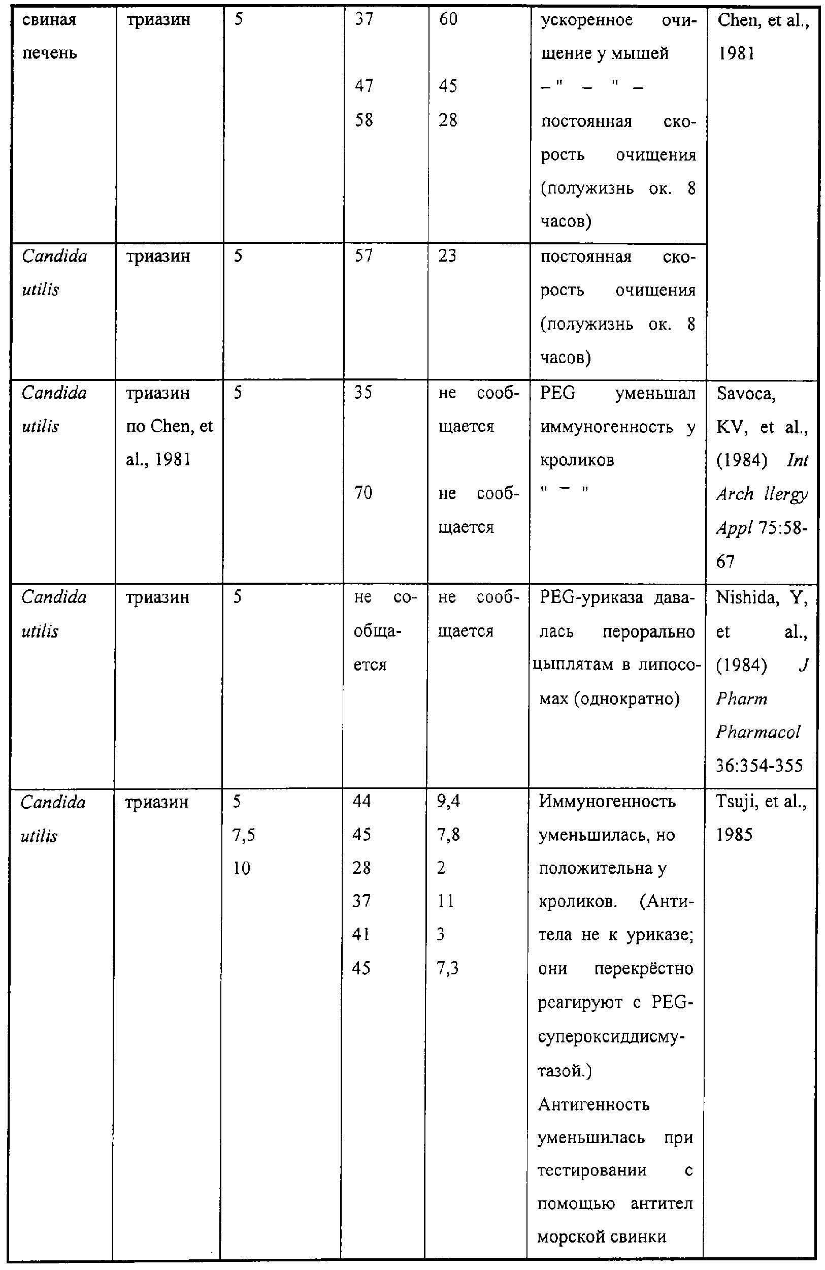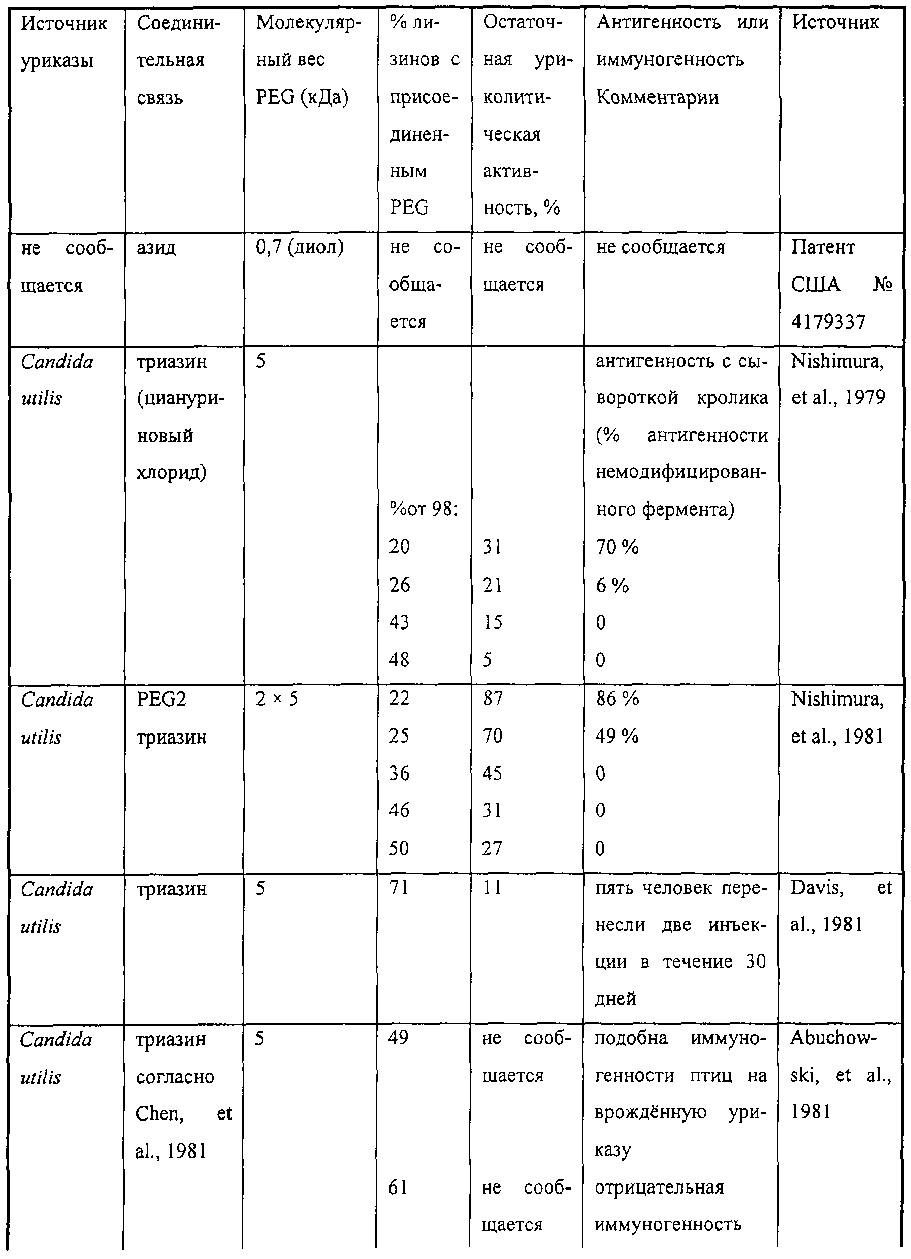 Японский патент №3-148298, выданный A Sano, et al., раскрывает модифицированные белки, в том числе уриказу, дериватизированные с PEG, имеющим молекулярный вес 1-12 кДа, которые проявляют уменьшенную антигенность и “улучшенное продленное” действие, и способы получения таких дериватизированных пептидов. Однако не раскрываются количество нитей, ферментные тесты, биологические тесты и значение выражения “улучшенное продленное”. Японские патенты №55-99189 и 62-55079, оба выданы Y Inada, раскрывают конъюгаты уриказы, полученные с помощью PEG-триазина или бис-РЕО-триазина (обозначенного PEG2 в Таблице 1) соответственно. См. Nishimura, et al., (1979 и 1981). В конъюгате первого типа молекулярные веса PEG составляли 2 кДа и 5 кДа, в то время как в конъюгате второго типа использовался только PEG с весом 5 кДа. Nishimura, et al., (1979) сообщает о восстановлении 15% уриколитической активности после модификации 43% доступных лизинов с помощью линейного PEG с весом 5 кДа, в то время как Nishimura, et al., (1981) сообщает о восстановлении 31% или 45% уриколитической активности после модификации 46% или 36% лизинов с помощью соответственно PEG2.