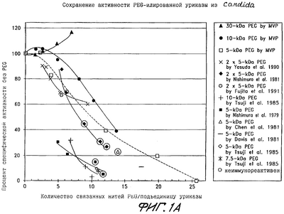 В конъюгатах, содержащих PEG с молекулярными весами между 5 кДа и 30 кДа, максимальное количество нитей PEG, связанных с одной подъединицей при сохранении по меньшей мере 75% уриколитической активности немодифицированного фермента, находится в диапазоне от 2 нитей для уриказы соевых бобов до более 10 нитей для СБХ-уриказы (см. условия теста в Примере 1 и результаты на фиг.1А-5Б). Последняя степень PEG-илирования соответствует приблизительно одной трети всех аминогрупп. В одном из вариантов выполнения среднее количество нитей PEG, связанных с каждой подъединицей уриказы, находится в пределах от 2 до 10. В предпочтительном выполнении среднее количество нитей PEG, связанных с каждой подъединицей уриказы, находится в пределах от 3 до 8. В еще более предпочтительном выполнении среднее количество нитей PEG, ковалентно связанных с каждой подъединицей уриказы, находится в пределах от 4 до 6. В еще одном выполнении молекулярный вес PEG, используемого для реакции связывания, находится в пределах от 5 кДа до 100 кДа, предпочтительно от 10 кДа до 60 кДа и более предпочтительно от 20 кДа до 40 кДа, например равен 30 кДа.
