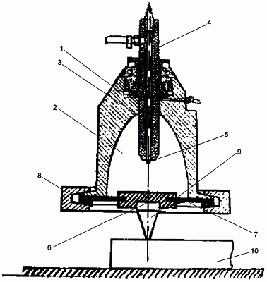 Сечение корпуса 1 и место установки его днища определяется из того, чтобы второй фокус эллипсоида вращения находился на плите 6 или на раскалывающем инструменте 9 с внешней стороны герметичной электроразрядной камеры 2. Обрабатываемые изделия 10 устанавливают под раскалывающим инструментом 9 таким образом, чтобы инструмент 9 откалывал заданный размер изделия 10. Для осуществления работы устройства по раскалыванию твердого и хрупкого материала используется известная и достаточно стандартная для подобных случаев электрическая система (не показана), которая обычно включает в себя источник тока и заряженный конденсатор, а также разрядный контур, состоящий из конденсатора, коммутатора и соединяющих проводов. С такой электрической системой связан положительный электрод 3 и узел плиты 6 с инструментом 9, выполняющий роль отрицательного электрода.