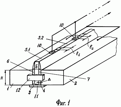 Как показано на чертежах, соединяемые электродуговой сваркой металлические изделия 1 и 2 толщиной – Н установлены с зазором друг относительно друга. В зазоре между свариваемыми поверхностями 3 и 4 соответственно металлических изделий 1 и 2 размещен неподвижный плявящийся электрод, который выполнен в виде М пластин 5.1, 5.2,…,5.М толщиной – и шириной – h, которая не меньше толщины Н металлических изделий 1 и 2. Между каждой свариваемой поверхностью 3, 4 и расположенной напротив нее соответствующей боковой поверхностью каждой пластины 5.1÷5.М неподвижного плавящегося электрода размещены соответственно прослойки 6 и 7 из диэлектрического материала толщиной , так что зазор между свариваемыми поверхностями 3 и 4 равен: +2 . Пластины 5.1÷5.М неподвижного плавящегося электрода расположены последовательно друг за другом по всей длине зазора между металлическими изделиями 1 и 2, при этом зазор – l1 между хвостовым торцом 8 каждой n-ой пластины 5.n (n=1, 2,…, М-1) неподвижного плавящегося электрода и передним торцом 9 расположенной рядом с ней n+1 пластины 5.(n+1) равен (1÷4)· и заполнен диэлектрическим материалом, например тем же, который используется для прослоек 6 и 7. Каждая пластина 5.1÷5.М неподвижного плавящегося электрода снабжена токоподводом 10, который размещен на расстоянии l2=(1÷6)· от ее хвостового торца 8. Токоподводы 10 подключены к одному полюсу источника питания (на чертежах не показан), а металлические изделия 1 и 2 – к другому его полюсу. К нижним поверхностям металлических изделий 1 и 2 (по всей длине зазора между ними) прижата нижняя подкладка 11, а к их боковым поверхностям – боковая подкладка 12. На фиг.3 схематично показаны положения профиля фронта оплавления в процессе отгорания пластин 5.1 и 5.2 обозначены соответственно. 13(t1), 13(t2), 13(t3), 13(t4), 13(t5), 13(t6), при этом t1234t56< , где – интервал времени, соответствующий нагреву сварочным током каждой пластины 5.1.÷5.М до заданной допустимой температуры.