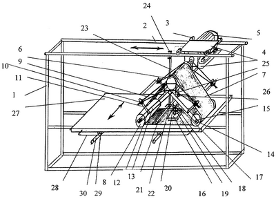 Необходимый режим обработки достигается комбинированным движением стола 27 и рамы 4. При необходимости смены ленты 7 откручиваются гайки 10 на винтах 11 (талрепы), винты 11 опускают рычаги 13, поворачиваясь на шарнирах 12 (предотвращается изгиб и заламывание винтов 11). Натяжение шлифовальной ленты 7 ослабляется и имеется возможность ее снять. Надевание и натяжение шлифовальной ленты 7 проводится в обратной последовательности. При настройке станка может наблюдаться сход шлифовальной ленты 7 с приводного или не приводных роликов 6 или 8 соответственно.