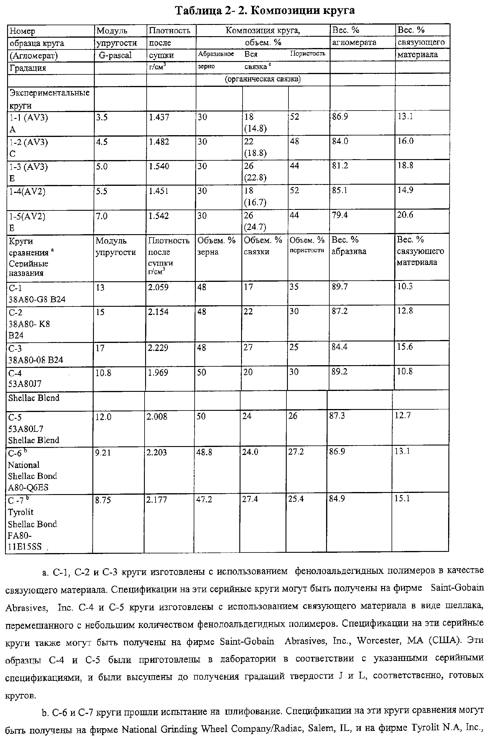 Результаты испытаний показывают, что экспериментальные круги, имеющие градации твердости D или G по шкале твердости фирмы Norton, имеют эксплуатационные параметры, эквивалентные параметрам кругов сравнения, имеющих более высокие градации твердости от Р до Т. Такие эксплуатационные параметры экспериментальных кругов являются особенно удивительными потому, что эти круги содержат только 30 объем.% абразивного шлифовального зерна, в то время как круги сравнения содержат 46 объем.% абразивного шлифовального зерна. Таким образом, круги в соответствии с настоящим изобретением позволяют максимально повысить эффективность шлифования индивидуальных зерен, существенно повысив эффективность зерна.