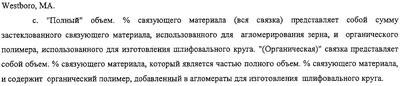 Связанные абразивные инструменты в соответствии с настоящим изобретением (шлифовальные круги, шлифовальные сегменты, шлифовальные диски, шлифовальные камни и хоны, совместно именуемые инструментами или кругами) характеризуются неизвестной ранее комбинацией структуры инструмента или круга и физических свойств. Используемый здесь термин «структура круга» относится к объемному проценту абразивного шлифовального зерна, связующего материала и пористости, которые имеются в шлифовальном круге. “Градация” твердости круга имеет буквенное обозначение, соответствующее поведению (работе) крута в операции шлифования. Для данного типа связующего материала градация твердости является функцией пористости круга, содержания зерна и некоторых физических свойств, таких как плотность в отвержденном состоянии, модуль упругости и проникновение песчаной струи (последнее обычно относится к застеклованным связанным кругам). «Градация» круга предсказывает, насколько стойким к износу будет круг во время шлифования и насколько твердым будет круг при шлифовании, то есть сколько мощности потребуется для использования круга в данной операции шлифования. Буквенное обозначение градации круга присваивают в соответствии с известной шкалой градаций фирмы Norton, причем самые мягкие градации обозначаются буквой А, а самые твердые градации обозначаются буквой Z (см., например, патент США No.-A-1,983,082). При сопоставлении градаций круга специалист обычно может составить спецификацию нового круга по аналогии с известным кругом и предсказать, что новый круг будет работать аналогично известному кругу.