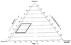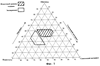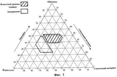На фиг.1 показана троичная диаграмма сравнения относительного объемного процента структур композиций стандартных органически связанных (связанных с использованием органического связующего материала) абразивных инструментов в соответствии с настоящим изобретением.