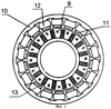 Электродвигатель 6 является трехфазным. Статор 10 выполнен с явно выраженными полюсами 11, на которых расположены катушки 12 по одной на полюс. Ротор 9 выполнен многополюсным с возбуждением от постоянных магнитов 13. Число полюсов статора 11 отличаются от числа полюсов ротора на два.
