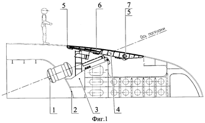 – на фиг.1 показан продольный (по диаметральной плоскости подводной лодки) разрез наружного погрузочного устройства в закрытом (подводном) положении;