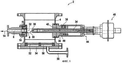 Сопло 30 для подачи газа предпочтительно выполнено подвижным вдоль его оси, что позволяет изменять, соответственно регулировать, расстояние между ним и входным отверстием 8 в боковой стенке вихревой камеры. В показанном на чертеже варианте выполнения устройства сопло 30 для подачи газа и соосно примыкающая к нему газоподающая труба 34 установлены подвижно в отверстии патрубка 36. В этом случае для осевого перемещения сопла для подачи газа предусмотрен, например, привод 48 аксиального типа, который присоединен к заднему концу 44 газоподводящей трубы. В другом варианте на заднем конце газоподводящей трубы можно предусмотреть червячную резьбу, взаимодействующую с соответствующей внутренней резьбой в пластине, смонтированной на патрубке. При приведении газоподводящей трубы 34 во вращение вокруг ее собственной оси с помощью соответствующего привода эта газоподводящая труба 34 вместе со смонтированным на ней соплом 30 в зависимости от направления ее вращения либо “ввинчивается” дальше в глубь вихревой камеры, либо “вывинчивается” из нее. Регулируемое таким путем расстояние между входным отверстием 8 и соплом для подачи газа может составлять, например, от 0 до 30 мм.