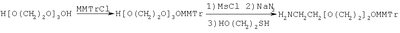 К раствору триэтиленгликоля (10 г, 66,5 ммоль) в пиридине (50 мл) прибавляли монометокситритилхлорид (2,7 г, 8,9 ммоль). Реакционную массу выдерживали 18 ч при 37°С. Продукт экстрагировали хлороформом в присутствии водного NaHCO3. Хлороформенные экстракты упаривали, остаток растворяли в пиридине (20 мл), охлаждали до 0°С и прибавляли метансульфонил хлорид (1,38 мл, 17,8 ммоль). Реакционную массу выдерживали 18 ч при 5°С, экстрагировали CCl4 в присутствии водного NaHCO3. Органические экстракты упаривали, остаток растворяли в диметилформамиде (30 мл), прибавляли NaN3 (1,16 г, 17,8 ммоль). Реакционную массу перемешивали 5 ч при 90°С, растворитель удаляли в вакууме, остаток экстрагировали CCl4 в присутствии воды. Органические экстракты упаривали, остаток растворяли в диметилформамиде (30 мл), прибавляли меркаптоэтанол (3 мл) и 25% водный аммиак (0,5 мл). Реакционную массу выдерживали 18 ч при комнатной температуре, наносили на колонку с Dowex-50 (NH4 + форма, 3×6 см), промывали колонку метанолом (50 мл), затем элюировали смесью метанола (90 мл) и 25% водного аммиака (10 мл). Растворители упаривали, остаток соупаривали с пиридином (2×20 мл), растворяли в пиридине (20 мл) и прибавляли 9-флуоренилметоксикарбонилхлорид (2,3 г, 8,9 ммоль) и выдерживали 18 ч при комнатной температуре. Реакционную массу разбавляли водным NaHCO3 и экстрагировали CCl4 (3×20 мл). Органические слои упаривали, соупаривали с толуолом (3×20 мл), прибавляли 80% водную уксусную кислоту (50 мл). Через 18 ч при комнатной температуре реакционную массу упаривали и хроматографировали на колонке (2×25 см) с силикагелем (63-100 мкм), элюировали 3% метанолом в хлороформе. Выход 440 мг (13%).