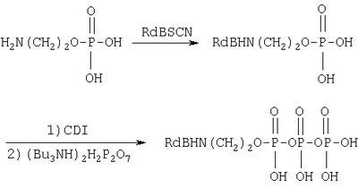 N-(Родаминаминотиокарбонил)-2-аминоэтиловый эфир фосфорной кислоты (40 мг, 0,045 ммоль) растворяли в диметилформамиде (3 мл), два раза соупаривали с диметилформамидом (2×3 мл), добавляли CDI (73 мг, 0,45 ммоль). Реакционную смесь перемешивали 18 ч при 4°С в атмосфере аргона, затем добавляли МеОН (0,33 мл, 8 ммоль) и оставили на 40 мин при 20°С. Реакционную смесь сконцентрировали до 2 мл и добавляли 0,45 М (Bu3NH)2H2P2O7 в ДМФ (1,5 мл). Реакционную смесь перемешивали 18 ч при 20°С, разбавляли водой (до 20 мл), раствор экстрагировали CCl4 (3 мл), н.бутанолом (2×3 мл) и наносили на колонку (2,5×10,5 см) с DEAE-целлюлозой, элюировали 30% раствором МеОН в градиенте концентрации NH4НСО3 (0 0,3М). Целевые фракции объединяли, концентрировали в вакууме и остаток лиофилизовали. Выход 9,7 мг (27%).