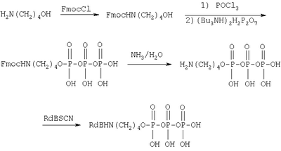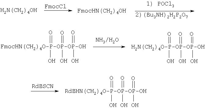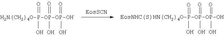 N-[(Зозинаминотиокарбонил)-4-аминобутиловый эфир трифосфорной кислоты (1з) получали из 4-аминобутилового эфира трифосфорной кислоты по методу, описанному в примере 6 для синтеза N-(родаминаминотиокарбонил)-4-аминобутилового эфира трифосфорной кислоты (1е) с использованием эозинизотиоцианата. Выход 17 мг (53%).