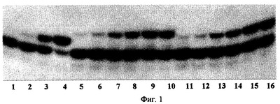 На фиг.1 представлено разделение продуктов реакции в денатурирующем 15% полиакриламидном геле после включения соединений 1а и 1б в 3′-конец олигонуклеотида (1) с помощью TDT: трек 1 – положение праймерного олигонуклеотида; треки 2-4 – включение ddATP, использованного как контроль, при концентрациях 0,01, 0,1 и 1 М соответственно; треки 5-10 включение 1a при концентрациях 0,05, 0,1, 0,25, 0,5, 1 и 2 М, соответственно; треки 11-16 – включение 1б при концентрациях 0,05, 0,1, 0,25, 0,5, 1 и 2 М соответственно.