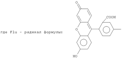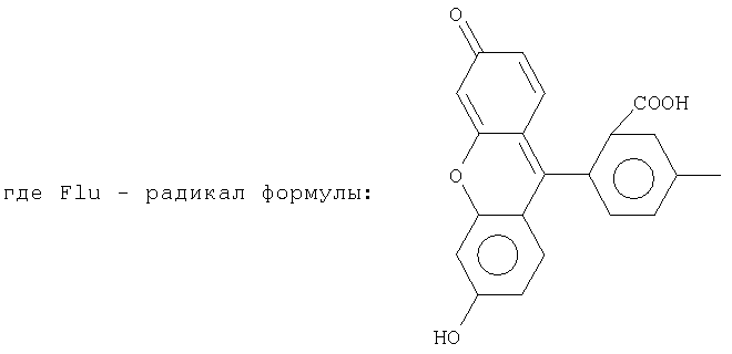 Растворяли N-[(9-Флуоренилметоксикарбонил)-8-амино-3,6-диоксаоктановый эфир трифосфорной кислоты (20 мг, 0,03 ммоль) в 25% водном аммиаке (5 мл). Через 16 ч при 5°С реакционную массу фильтровали, фильтрат упаривали до объема около 1 мл, приливали диметилформамид (1 мл), добавляли флуоресцеин изотиоцианат (20 мг, 0,05 ммоль) и триэтиламин (20 мкл). Перемешивали реакционную массу 18 ч при комнатной температуре, упаривали, соупаривали с водой (3×10 мл) и наносили на колонку (2×18 см) с LiChroprep RP-8 (25-40 мкм). Элюировали 0,05 М водным NH4HCO3. Выход 1 мг (5%).