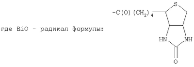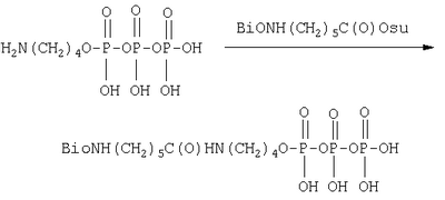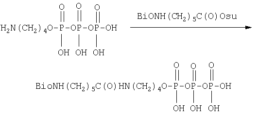 N-[(6-N-биотиниламиногексаноил)]-4-аминобутиловый эфир трифосфорной кислоты (1к) получали получали из 4-аминобутилового эфира трифосфорной кислоты по методу, описанному в примере 6 для синтеза N-(родаминаминотиокарбонил)-4-аминобутилового эфира трифосфорной кислоты (1е) с использованием N-оксисукцинимидного эфира 6-N-биотиниламиногексановой кислоты. После проведения реакции и экстракции остаток разбавляли водой до 20 мл и наносили на колонку (2,5×4,5 см) с DEAE-целлюлозой (НСО3 –). Колонку промывали 30% МеОН (50 мл), 0,12 М NH4НСО3 в 30% МеОН (100 мл), соединение (1к) элюировали 30% раствором МеОН в 0,25 М NH4HCO3 (100 мл), концентрировали в вакууме, остаток растворяли в воде и лиофилизовали. Выход 13 мг (47%).