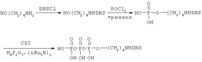 К раствору триэтиламмонийной соли N-(5-N,N-диметиламинонафталин-1-сульфонил)аминобутил фосфата (15,1 мг, 25 мкмоль) в абс. ДМФ (3 мл) добавляли N,N’-карбонилдиимидазол (CDI) (32 мг, 0,2 ммоль). Реакционную смесь перемешивали 18 ч при 4°С в атмосфере аргона, затем добавляли МеОН (0,33 мл, 8 ммоль) и оставляли на 40 мин при 20°С. Реакционную смесь концентрировали до 2 мл и добавляли 0,3 М (Bu3NH)2H2P2O7 в ДМФ (0,5 мл). Реакционную смесь перемешивали 18 ч при 20°С, затем разбавляли водой до 10 мл и наносили на колонку с Dowex 50 (2×5 см) в NH4 + форме, элюировали водой. УФ-поглощающие фракции упаривали, остаток растворялили в 0,3 мл воды и нанесли на колонку с LiChroprep RP 8 (1×15 см) в 5 мМ NH4HCO3. Элюцию проводили в линейном градиенте концентраций МеОН (0 20%) в 5 мМ NH4НСО3. Фракции, содержащие целевой продукт, упаривали, переупаривали с водой (2×5 мл) и лиофилизовали. Выход 5,9 мг (9,3 мкмоль, 37%).