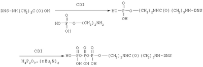 К раствору N-[(5-N,N-диметиламинонафталин-1-сульфонил)аминогексановой кислоты (54 мг, 0,15 ммол) в 3 мл абс. ДМФ добавляли CDI (48 мг, 0,3 ммоль). Реакционную смесь перемешивали 1 ч при 20°С, затем добавляли к раствору аминоэтилфосфата (28 мг, 0,2 ммол) в 3 мл воды и 20 мкл триэтиламина. Через 18 ч при 20°С смесь разбавляли водой (50 мл) и наносили на колонку с DEAE-Toyopearl 650 (2×9 см). Элюировали в линейном градиенте концентраций NH4HCO3 (0 0,4 М, 0,6 л) в 10% МеОН. Фракции, содержащие продукт, упаривали, переупаривали с водой (10×10 мл), остаток лиофилизовали. Выход 49,5 мг (95 мкмоль, 63%).