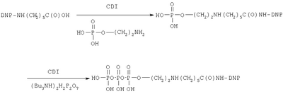 К раствору 6-N-(2,4-динитрофенил)аминогексановой кислоты (44 мг, 0,15 ммоль) в 3 мл абс. ДМФ добавляли CDI (48 мг, 0,3 ммоль). Реакционную смесь перемешивали 1 ч при 20°С, затем добавляли к раствору аминоэтилфосфата (28 мг, 0,2 ммоль) в 3 мл воды и 20 мкл триэтиламина. Через 18ч при 20°С смесь разбавляли водой (50 мл) и наносили на колонку с DEAE-Toyopearl 650 (2×9 см), элюировали в линейном градиенте концентраций NH4НСО3 (0 0,4 М, 0,6 л) в 10% МеОН. Фракции, содержащие продукт, упаривали, переупаривали с водой (10×10 мл), остаток лиофилизовали. Выход 44,8 мг (0,1 ммоль, 67%).