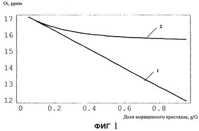 Если рассмотреть график распределения кислорода по длине кристалла (фиг.1), то благодаря плавному повышению скоростей вращения тигля и кристалла линия, показывающая распределение кислорода по длине (кривая 2), будет близкой к параллельной оси абсцисс или под небольшим углом к ней. Это говорит о равномерном или близком к равномерному распределению кислорода.