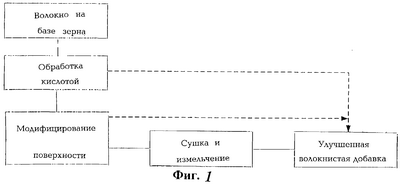 В соответствии с настоящим изобретением предлагается способ обработки волокнистого материала на базе зерна (SBF) для получения улучшенной волокнистой добавки (EFA). Этот способ предусматривает проведение обработки SBF при помощи кислоты (“операция кислотной обработки”) для получения обработанного кислотой волокна или модифицированного волокнистого материала на базе зерна. (Под “модифицированным” материалом в данном контексте понимают, что SBF не находится больше в своей необработанной форме). Обработанное кислотой волокно может быть промыто и использовано как улучшенная волокнистая добавка. В предпочтительном варианте обработки, обработанное кислотой волокно обрабатывают при помощи модификатора (“операция модификации поверхности”) для получения модифицированного волокна. Модифицированное волокно затем может быть промыто и использовано как предпочтительная улучшенная волокнистая добавка (EFA). Схема последовательности операций для предпочтительного способа и некоторые избранные вариации процесса показаны на фиг.1. (Факультативно и преимущественно волокно SBF может быть промыто или обработано иным образом ранее проведения операции кислотной обработки). В данном случае термин SBF главным образом относится к волокнистому материалу до кислотной обработки, вне зависимости от того, был ли он предварительно промыт или обработан иным образом.