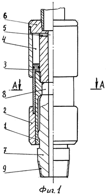 Скважинный разъединитель включает следующие основные узлы: цанга 1, заневоленная подвижной втулкой 2, поршень 3, помещенный в кольцевую цилиндрическую полость 4, отверстие 5 в переводнике 6. Нижняя часть разъединителя выполнена в виде штока 7, верхний конец 8 которго имеет многогранную форму, а нижний – резьбу 9.