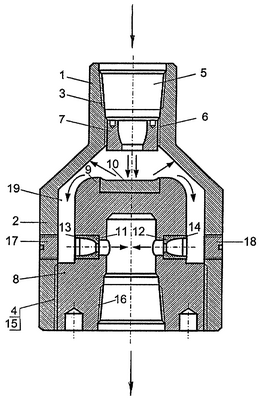 Его в собранном виде, как это изображено на чертеже, на резьбах 3 и 16 присоединяют к напорной линии цементировочного агрегата или бурового насоса так, чтобы диспергируемая смесь поступала со стороны корпуса с меньшей ступенью 1.