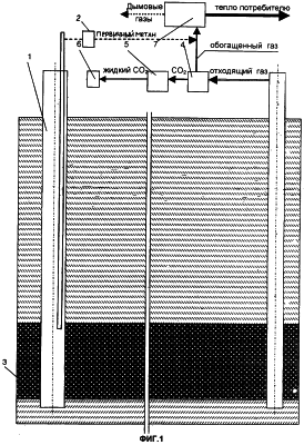 Заявленный способ целесообразно использовать на станциях подземной газификации или при наличии участка подземной газификации, что позволяет отбирать для реализации способа, диоксид углерода, содержащийся в отходящих газах подземных газогенераторов (на чертежах не показаны), работающих на станции. Нижеприведенный пример приведен именно для таких условий реализации.
