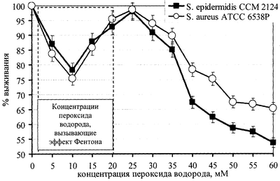 На первом этапе исследований были определены концентрации пероксида водорода, вызывающие эффект Фентона. Для этого готовили взвеси из музейных культур Staphylococcus aureus ATCC 6538P и Staphylococcus epidermidis CCM 2124 (способ приготовления взвесей: 24-часовую агаровую культуру микроорганизмов смывали стерильным 0,9% раствором хлорида натрия и готовили микробные взвеси, оптическая плотность которых соответствовала 0,27 при 591 нм на СФ-46). К 0,4 мл полученных микробных взвесей добавляли по 0,8 мл раствора пероксида водорода в концентрациях от 0,5 до 60 мМ с интервалом в 5 мМ, инкубировали в течение 30 минут при 37°С. Инкубированные смеси центрифугировали (3000 g в течение 15 минут), отделенные клетки культур микроорганизмов дважды отмывали стерильным 0,9% раствором хлорида натрия и готовили из них микробные взвеси, оптическая плотность которых соответствовала 0,27 при 591 нм на СФ-46. К 0.4 мл полученных микробных взвесей добавляли 2,6 мл жидкой питательной среды (мясопептонный бульон) и инкубировали в течение 3-5 часов при 37°С при периодическом перемешивании, затем измеряли оптическую плотность бульонных культур в опыте и контроле при 591 нм на СФ-46. Результаты исследований представлены на чертеже, отражающем выживаемость культур Staphylococcus aureus ATCC 6538P и Staphylococcus epidermidis CCM 2124 в зависимости от концентрации пероксида водорода.