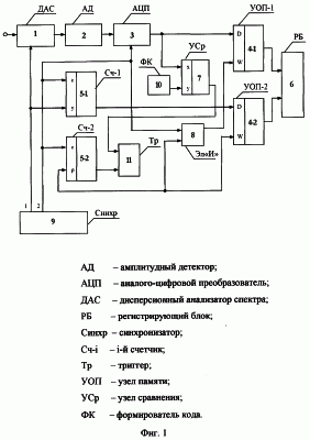Предлагаемое устройство содержит последовательно соединенные дисперсионный анализатор спектра 1, вход которого является входом устройства, амплитудный детектор 2, аналого-цифровой преобразователь 3 и узел оперативной записи 4-1, а также первый и второй счетчики 4-1 и 4-2, второй узел оперативной памяти 4-2, регистрирующий блок 6, узел сравнения 7, элемент И и синхронизатор 9, первый выход которого подключен к синхровходу анализатора 1, а второй выход соединен с тактовым входом аналого-цифрового преобразователя 3 и счетным входом счетчиков 5-1 и 5-2. В устройство введены также формирователь кода 10 и триггер 11, обнуляющий вход которого подключен к выходу переноса счетчика 5-2, а установочный вход соединен с выходом узла сравнения 7, первый вход которого подключен к выходу формирователя кода 10, а второй – объединен с входом узла 4-1, вход записи которого подключен к выходу элемента И (8), первый вход которого соединен с тактовым входом аналого-цифрового преобразователя 3, а второй вход подключен к выходу триггера 11, режимному входу счетчика 5-2 и входу записи узла памяти 4-2, информационный вход которого соединен с выходом счетчика 5-1, причем выходы узлов памяти 4-1 и 4-2 подключены к соответствующим входам регистрирующего блока 6, а управляющий вход счетчика 5-1 объединен с синхровходом анализатора 1.