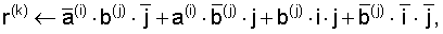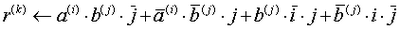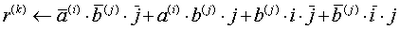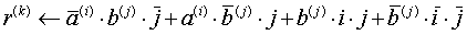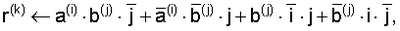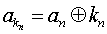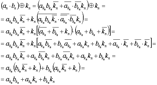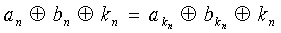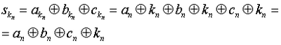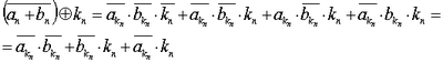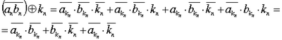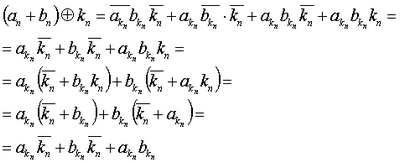 Кроме того, предполагается, как в случае уравнения (5), что зашифрованный операнд akn получается из незашифрованного операнда an посредством операции «исключающее ИЛИ» с ключом kn. Для простоты то же самое предполагается для операнда bkn. Таким образом, bkn эквивалентно результату операции «исключающее ИЛИ» над незашифрованным операндом bn с ключом kn. В вышеприведенном примере, спецификация вычисления над открытым текстом имеет вид: a И b. Спецификация вычисления над шифрованным текстом, которая получается в результате нескольких математических подопераций и в соответствии с которой реализуется блок шифрования, вытекает следующим образом из первой строки уравнения (5):