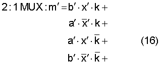 Хотя на нижеследующих фиг. 2а-7b в качестве основы всегда предполагается шифрование посредством побитового «исключающего ИЛИ» с ключом kn, очевидно, что в качестве алгоритма шифрования можно использовать любую другую обратимую операцию, например, операцию «исключающее НЕ-ИЛИ». Кроме того, в качестве алгоритмов шифрования можно использовать любые другие обратимые алгоритмы шифрования. Единственное предварительное условие состоит в том, что нужно найти выражения, в которых только зашифрованные операнды ak, bk и параметр шифрования k существуют в состоянии, когда они подверглись некоторой логической обработке, например, инвертированы или связаны или появляются в общем случае в математической функции, что становится очевидным при обзоре математических законов, например, правил эквивалентности для арифметических вычислений по аналогии с приведенными ниже примерами.