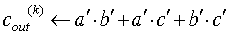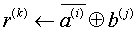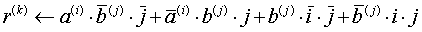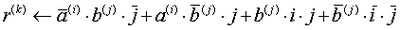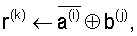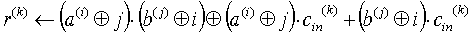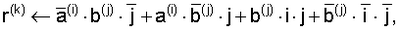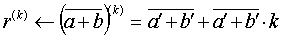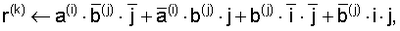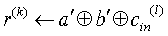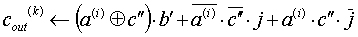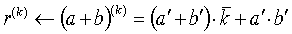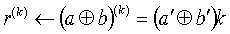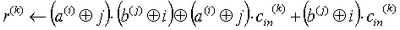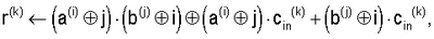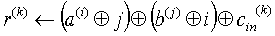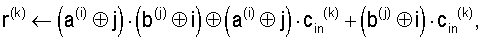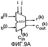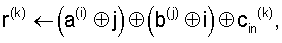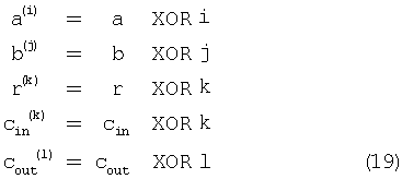 где a(i) – первый операнд, зашифрованный с помощью первого параметра шифрования, и b(j) – второй операнд, зашифрованный с помощью второго параметра шифрования, i – первый параметр шифрования, j – второй параметр шифрования, k – третий параметр шифрования, причем третий параметр шифрования является результатом операции Исключающее ИЛИ над первым и вторым параметрами шифрования, r(k) – результат операции, зашифрованный с помощью третьего параметра шифрования, и cin (k) – входной перенос, зашифрованный с помощью третьего параметра шифрования.