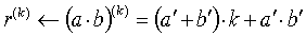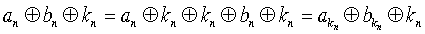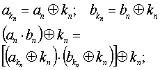 Незашифрованные операнды an и bn были заменены в уравнении (5) математической комбинацией зашифрованного операнда akn и ключа kn и bkn и ключа kn, соответственно, и эта математическая комбинация является обратной алгоритму шифрования. Таким образом, в правой части уравнения (5а) представлена спецификация вычисления над шифрованным текстом, полученная непосредственно из спецификации вычисления над открытым текстом.
