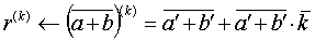 Как уже было объяснено, для нижеследующих иллюстративных реализаций АЛУ 10, отвечающего изобретению, в целях упрощения представления, предполагается шифрование операндов «а» и «b» посредством побитового «исключающего ИЛИ», причем зашифрованные операнды и/или зашифрованные результаты обозначаются индексом k, параметр шифрования обозначается k, и индекс n является индексом счета для n-го бита соответствующего операнда и/или ключа. Зашифрованные биты на входе вычислительного устройства, отвечающего изобретению, вычисляются следующим образом: