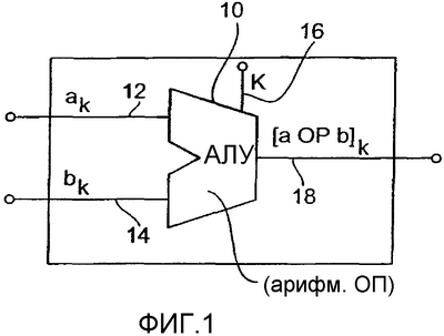 На фиг.1 показано вычислительное устройство, отвечающее изобретению, для выполнения арифметической операции над, по меньшей мере, двумя операндами, причем, по меньшей мере, два операнда являются зашифрованными операндами ak и bk. Вычислительное устройство, отвечающее изобретению, содержит арифметико-логическое устройство АЛУ 10, которое содержит, помимо первого входа 12 для первого зашифрованного операнда ak, второй вход 14 для второго зашифрованного операнда bk. АЛУ 10, отвечающее изобретению, дополнительно содержит третий вход 16 для параметра шифрования k, а также выход 18 для вывода зашифрованного результата арифметической операции ОП (ОР), осуществляемой АЛУ 10. Арифметико-логическое устройство 10 позволяет связывать первый вход 12, второй вход 14 и третий вход 16 для параметра шифрования k с учетом вида шифрования операндов ak, bk, с использованием арифметических подопераций таким образом, что на выходе получаются зашифрованный результат, который равен значению, можно было бы получить, подвергнув первый операнд «а» арифметической операции ОП в незашифрованном виде и подвергнув второй операнд «b» арифметической операции ОП в незашифрованном виде, а потом зашифровав полученный результат, что представлено квадратными скобками и индексом k на фиг.1. В арифметико-логическом устройстве 10 не осуществляется никакого дешифрования операндов ak и bk, но имеют место только такие подоперации, которые выполняются над зашифрованными операндами ak, bk и над параметром шифрования k или над инвертированными зашифрованными операндами, или над инвертированным параметром шифрования, или над промежуточными результатами предыдущих операций.