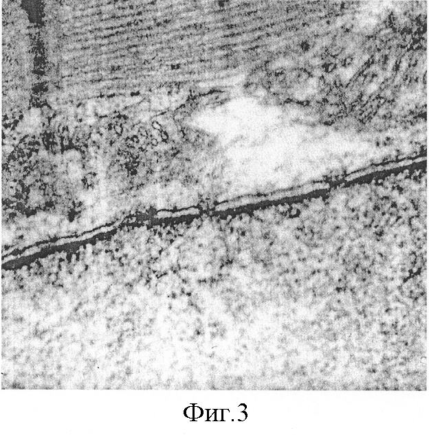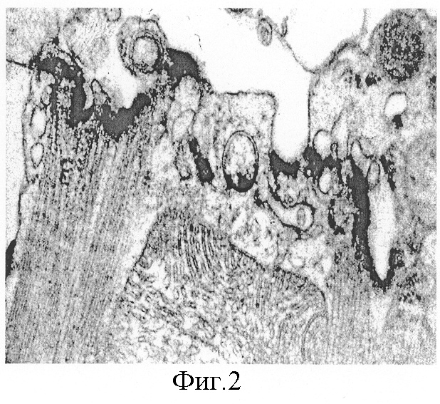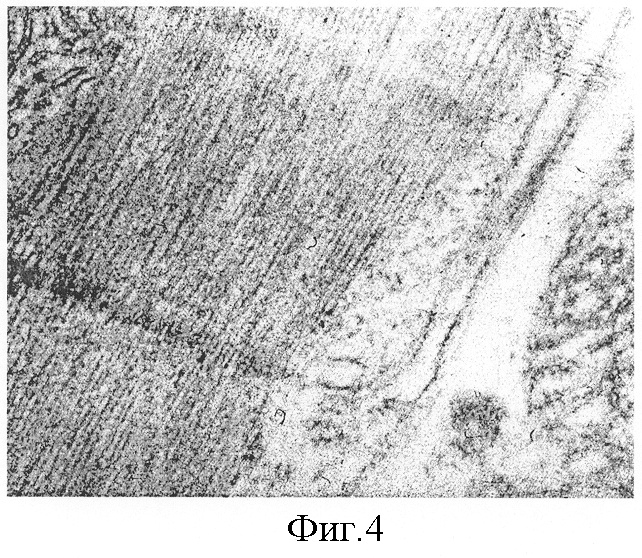На электронных микрофотографиях хорошо просматривалась типичная структурная организация кардиомиоцита. Сарколемма, митохондрии, саркоплазматический ретикулум (СПР) и миофибриллы имели характерный вид; наблюдались упорядоченная организация саркомеров и хорошо выраженные Z-полоски, четкое расположение актиновых миофиламентов относительно миозина (фиг.2). Кардиомиоциты имели ядро овальной формы, расположенное почти по центру клетки, на его мембране легко различаются нормально расположенные ядерные поры (фиг.3). В области вставочных дисков мембрана имеет неоднородную структуру (фиг.4). Миофибриллы разделены СПР и митохондриями, достаточно плотно упакованы и занимают практически все внутриклеточное пространство.