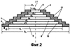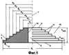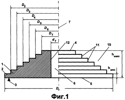 Шаги b ступеней обеих образующих 11 и 13, отсчитываемые и нумеруемые в осевом направлении, выбраны попарно одинаковыми, то есть в сечении звуковой элемент 1 представляет собой монолитное тело вращения, состоящее из совокупности семи цилиндрических дисков, внутренний и наружный диаметры которых плавно уменьшаются в направлении от большего основания к меньшему вдоль оси 7 симметрии. Пример 2 относится к конструкции, имеющей одинаковый шаг ступеней (фиг.2), а пример 3 – к конструкции с плавно изменяемым шагом ступеней (фиг.3).