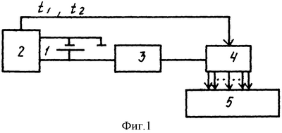 Принцип измерения поясняется фигурой 2. В рассматриваемых устройствах /1, 3/ большое неудобство представляет разделительный конденсатор, который для инфранизкочастотного сигнала должен быть большой величины и для получения точного отсчета иметь чрезвычайно малые токи утечки. Практика показала, что выполнение этих условий затруднительно. Проще оказывается использование компенсирующего устройства (КУ), включаемого в тракт измерения последовательно и встречно с напряжением АБ (ХИТ) и компенсирующим его постоянную составляющую в момент времени t1, соответствующий нулевому значению эталонного тока iэт. Однако при использовании КУ возникает новый источник погрешности – неточность компенсации Uк, непосредственно влияющей на результат измерения. Для исключения этой погрешности рекомендовано в момент времени t2 аналогичное повторное измерение величины Uхитsin при противоположенной полярности последней. Результат второго измерения с учетом своего знака вычитается из результата первого измерения и, таким образом, погрешность компенсации любой величины и знака автоматически устраняется. Измеряемая величина пропорциональна показаниям регистра результата 5 и оказывается выраженной в долях от тока, протекающего через АБ, и, следовательно, будет соответствовать значению реактивного сопротивления батареи.